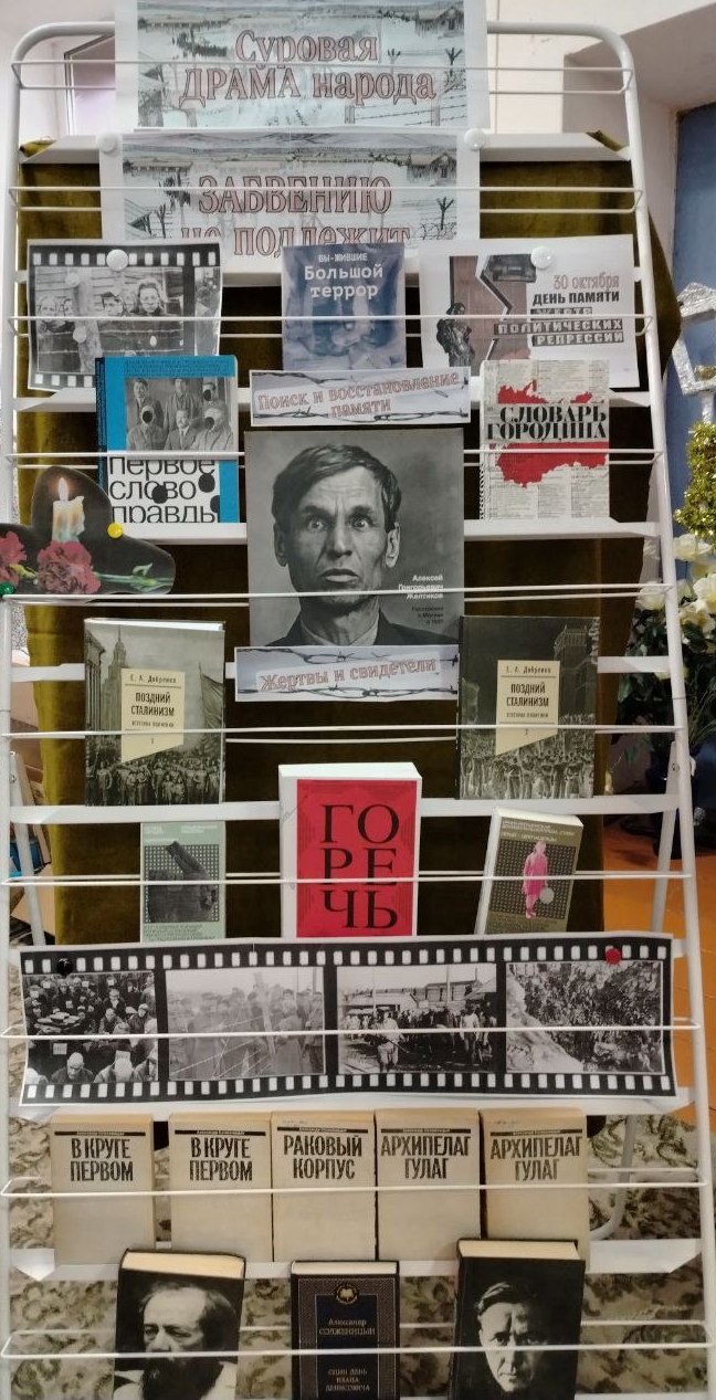 Ко Дню памяти жертв политических репрессий в библиотеке с 29.10 по 10.11 2025 работает книжная выставка – память «Суровая драма народа, забвению не подлежит!», на которой представлена документальная литература и произведения писателей и поэтов, которые сами побывали в жерновах репрессий, рассказывающие об этой трагической странице в истории нашей страны.