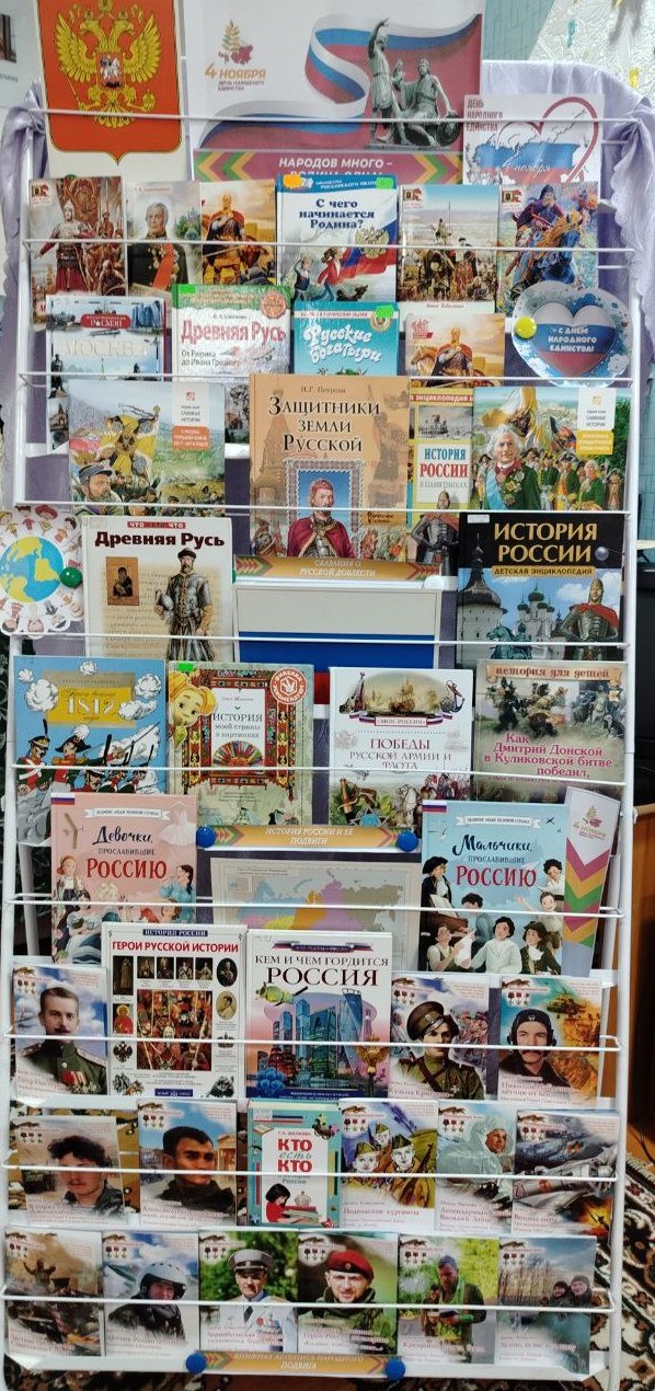 Присутствующие приняли участие в историческом экскурсе «Пока мы едины, Россия жива», посвященном Дню народного единства. Россия объединила множество народов, у каждого из которых — собственная история, культура, традиции, проверить свои зная помогли экспресс – кроссворд "Культура народов России". Посмотрели документальный фильм «Минин и Пожарский». Декоративно-прикладная выставка "Рукотворное очарование" познакомила посетителей с творчеством Масловской Виктории, которая представила работы из бумажной лозы.